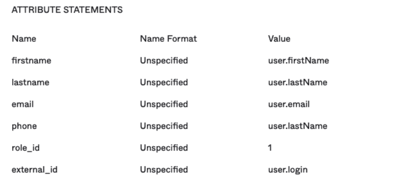 4. Next, configure all Attribute statements. It’s important to have all the attributes/parameters configured. The most important one is role_id, if you don't have a way to match it on your end, it will need to be hardcoded.
