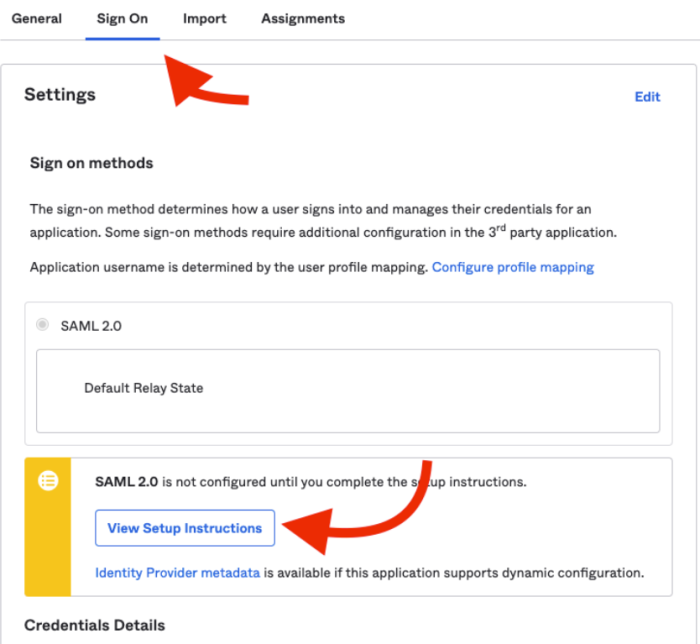 5. Once the previous steps are completed, you will be redirected to the Sign On tab, where you will find a button View Setup Instructions. There you will find the information you will need to finish the SSO setup in the Liveclicker platform.