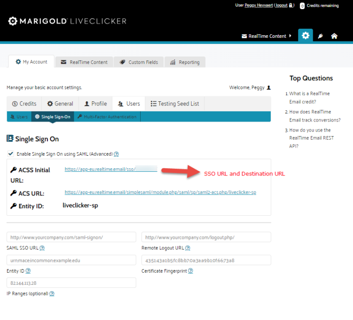 • Single sign-on URL — In your Liveclicker account, under Account Settings -> Users -> Single Sign On, you will find the sign-on URL, which is a unique account URL as ACSS Initial URL.
