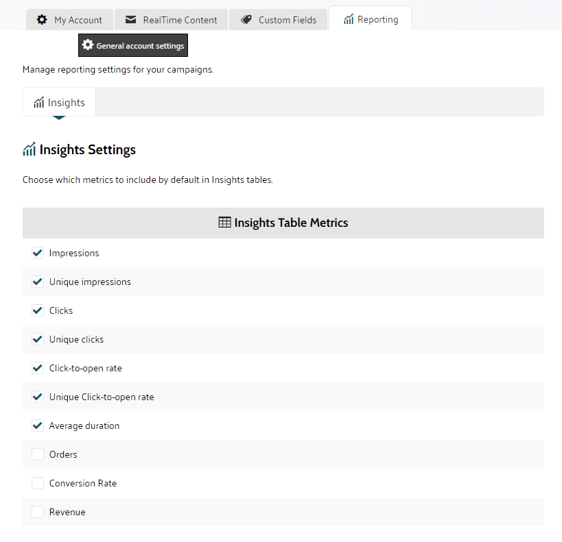 Reports that are surfaced in the Insights section of Liveclicker can be personalized to reflect your choice of metrics to display: