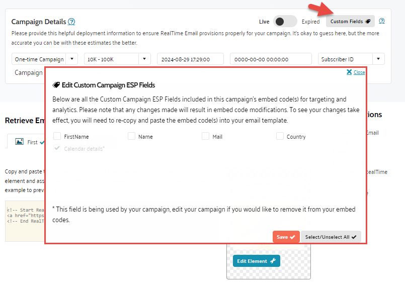 Edit Custom fields — By default Liveclicker includes all custom fields in the embed code of your campaign. If you are using more than one ESP to send your email campaigns out, and do not want all the fields included in every campaign, you can edit the inclusion of these fields on a campaign by campaign basis.