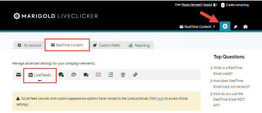 1. To configure a new Connector Code, go to the Account Settings in the top menu, and then navigate to Realtime content>LiveFeeds: