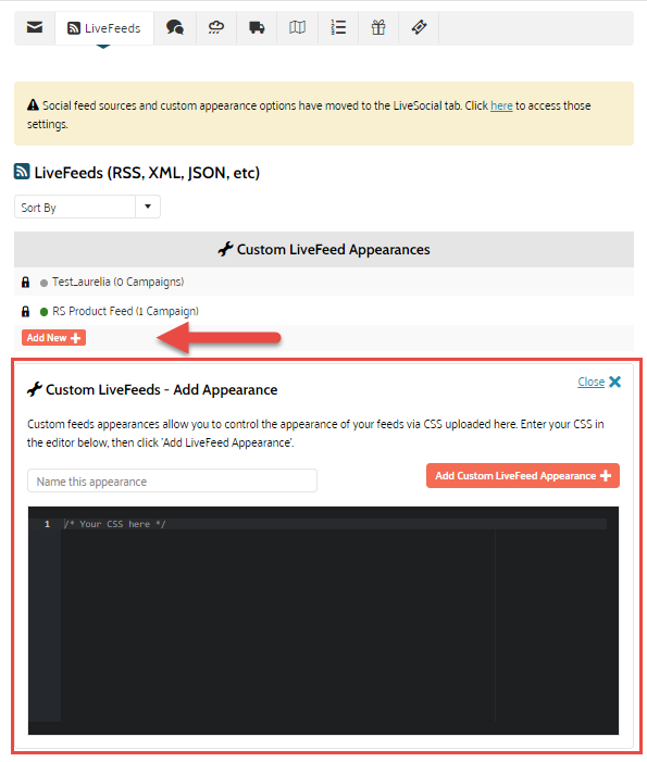 2. In the Custom LiveFeed Appearances section, click Add New +. A Window is loaded in which the proposed CSS code can be modified.