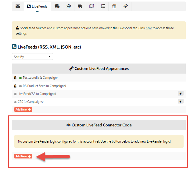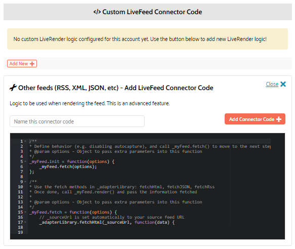 2. In the Custom LiveFeed Connector Code section, click Add New +.