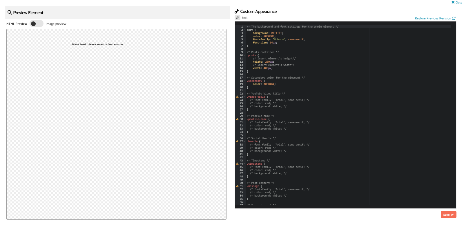 To set up a Custom LiveFeed, you must first configure your custom CSS appearance and a Custom Connector Code.