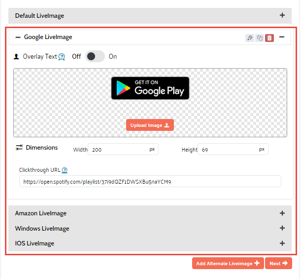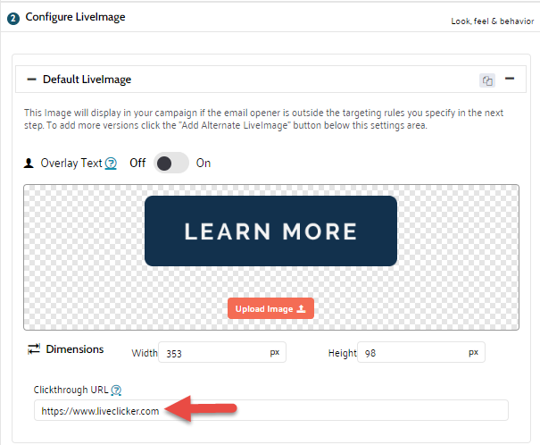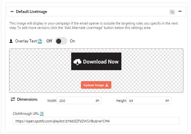 The LiveImage configuration options for a LiveImage from a template are similar to the ones for a LiveImage created from scratch. Check out the topic on Creating a LiveImage campaign from scratch for more details on how to configure overlay text and fallback images.