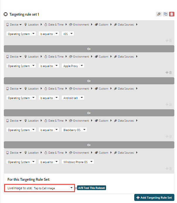 Pre-configured targeting rules to show the Tap to Call button to all mobile openers. All other openers will get the default version.