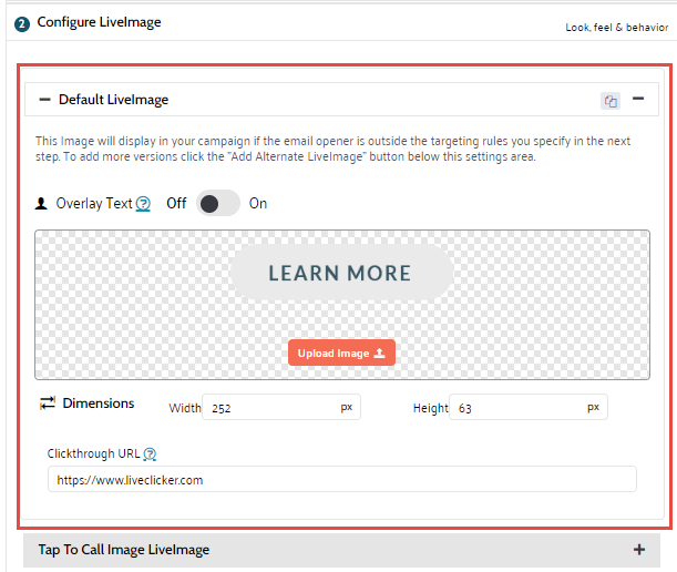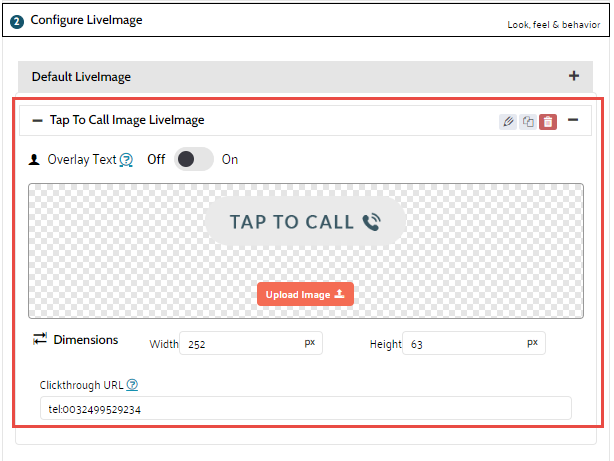 Your Tap to Call LiveImage will be automatically created with the following configuration:
