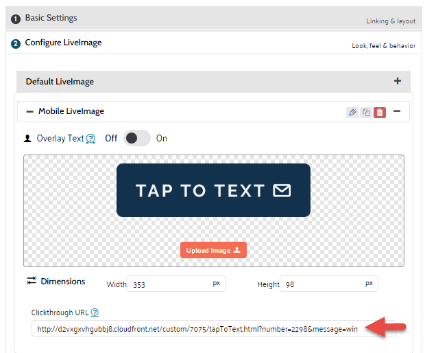 Your tap to text LiveImage will be automatically created with the following configuration: