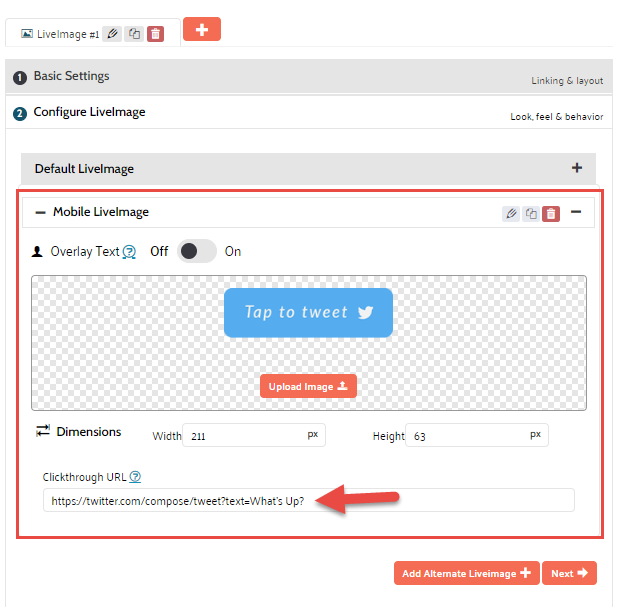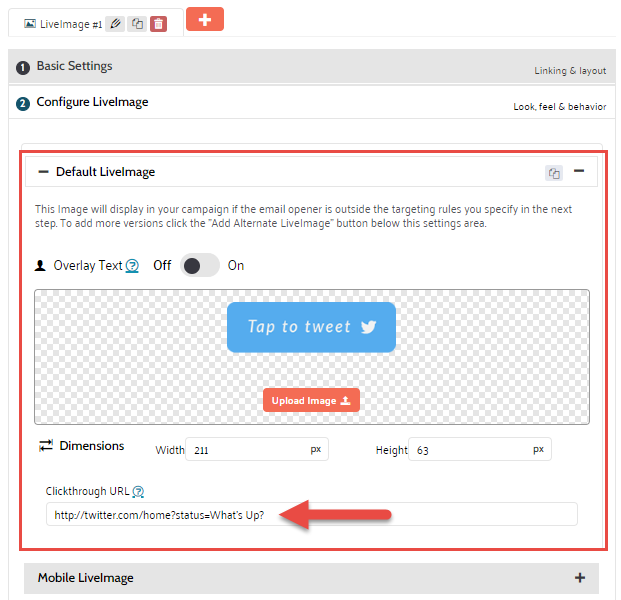 Your tap to tweet LiveImage will be automatically created with the following default configuration: