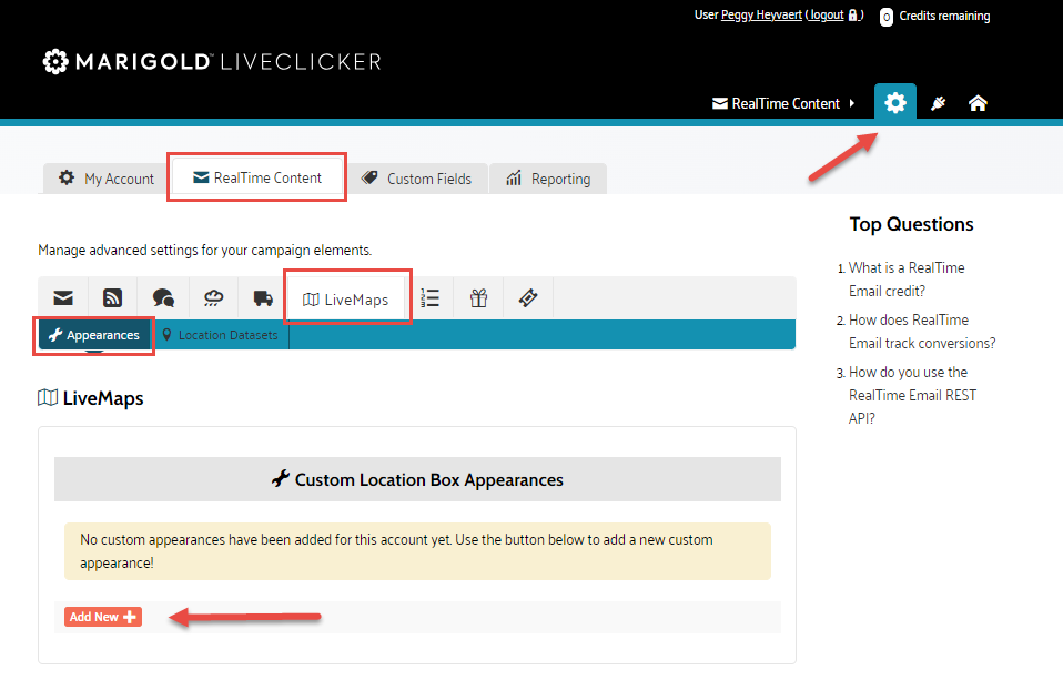 1. To configure a new CSS, go to the Account Settings in the top menu, and then navigate to Realtime content>LiveMap>Appearances: