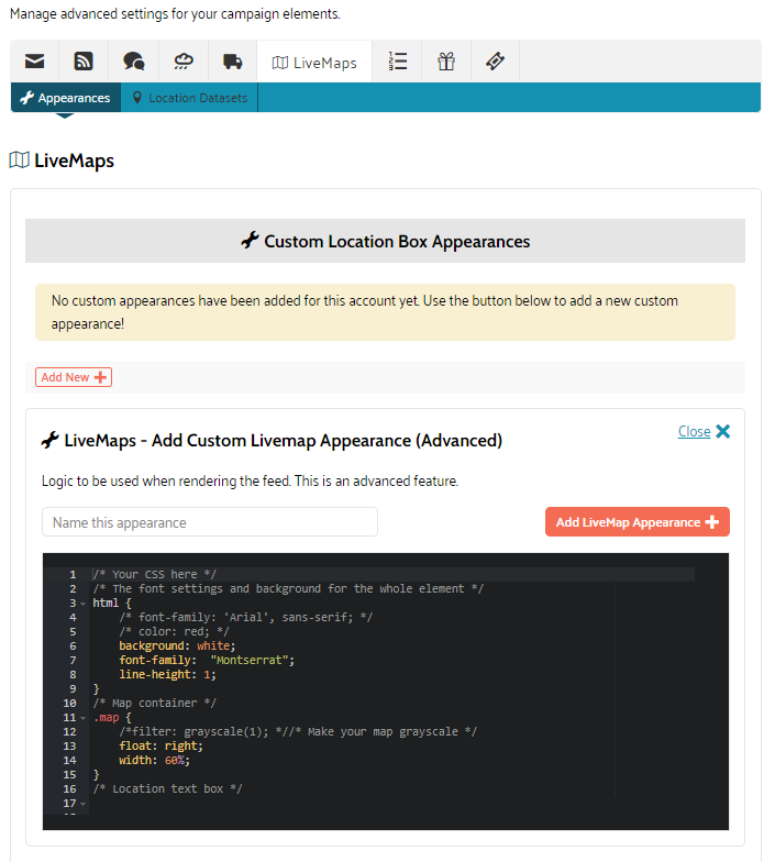 6. When done, click Add LiveMap Appearance. The custom CSS can now be used in your LiveMap elements.