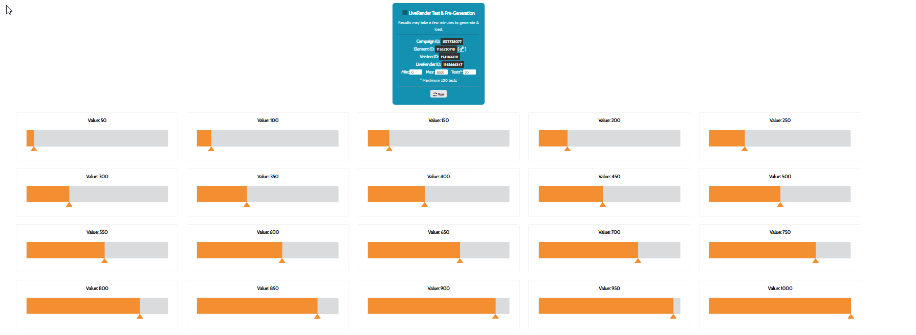 8. You can also Generate a Full test. Every frame within the animation is shown, together with the values they represent. To be able to use this feature you must be able to pull usable ranges from your JSON code. It needs to have at least one input node with a source, and min and max properties. Generating this test page will also help make your campaign run faster by pre-generating your images.
