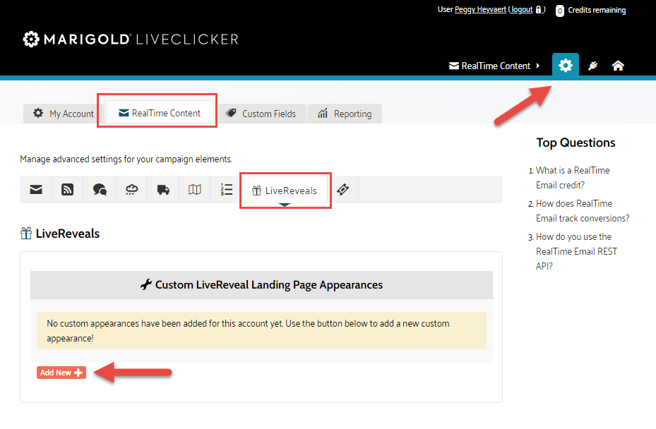 1. To configure a new CSS, go to the Account Settings in the top menu, and then navigate to Realtime Content > LiveReveal: