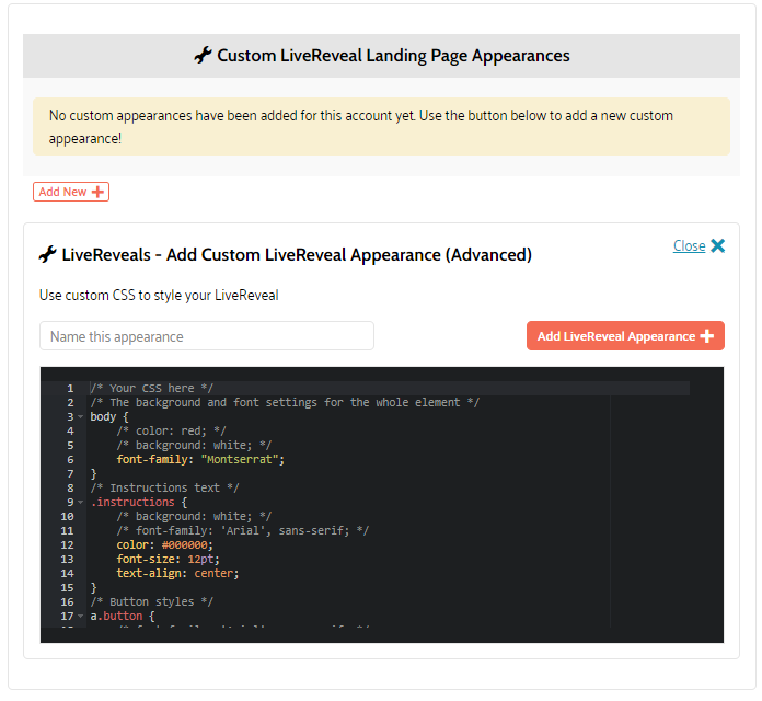 6. When done, click Add LiveReveal Appearance. The custom CSS can now be used in your LiveReveal elements.