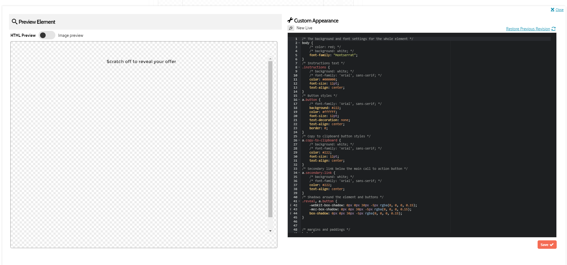 Liveclicker allows you to create custom Liveclicker appearances using CSS. Custom appearances can be applied to LiveReveals with Landing Page Experience selected.