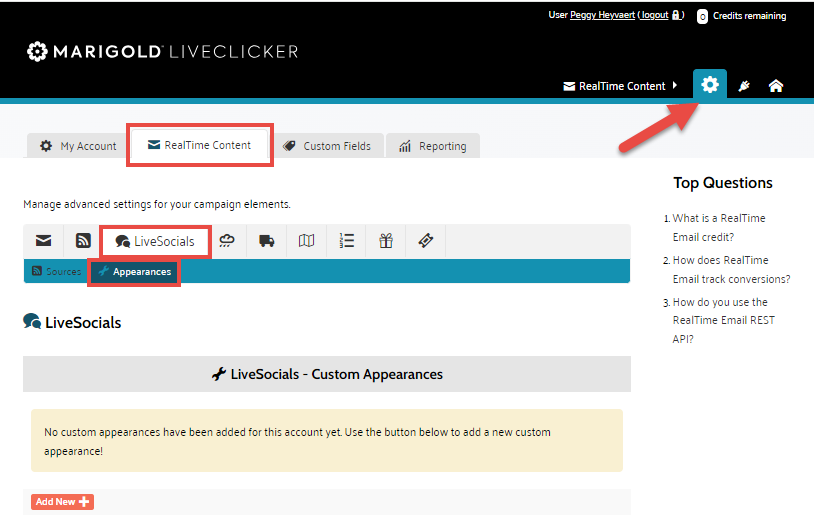 1. To configure a new CSS, go to the Account Settings in the top menu, and then navigate to Realtime content>LiveSocial: