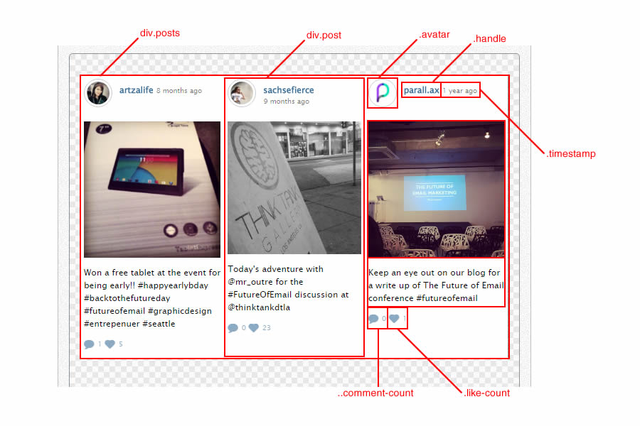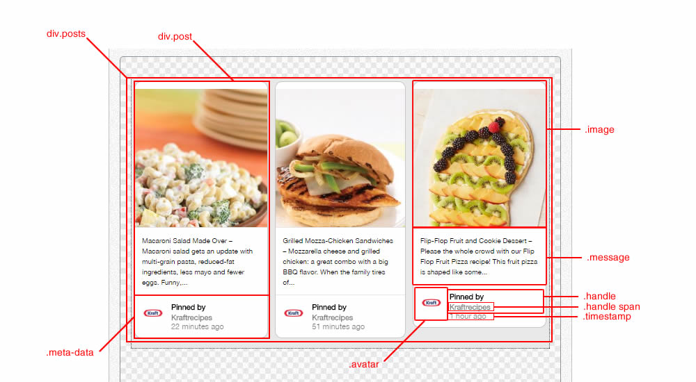 Below is an example of the CSS styles used for a Curalate feed with square images, you can use this as a starting point for your custom appearance: