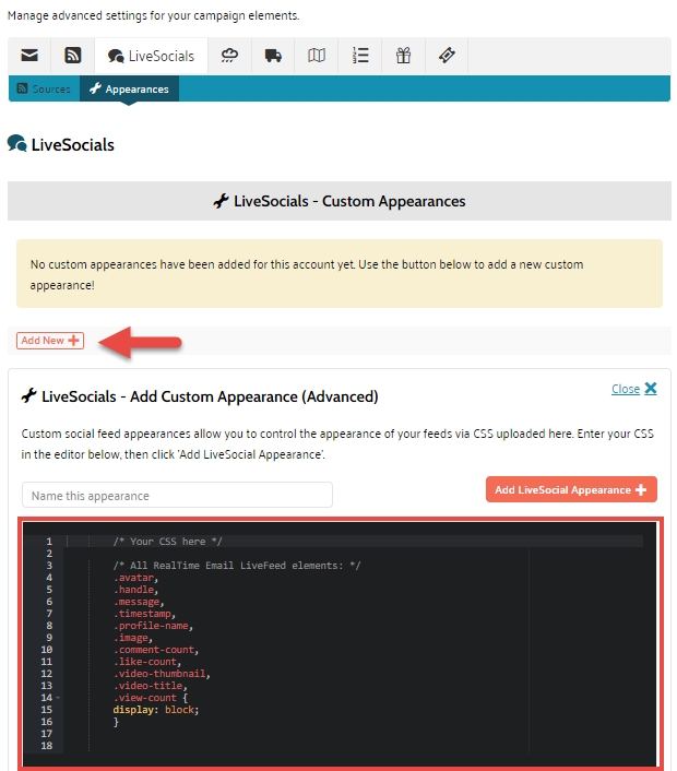 6. When done, click Add LiveSocial Appearance. The custom CSS can now be used in your LiveSocial elements.