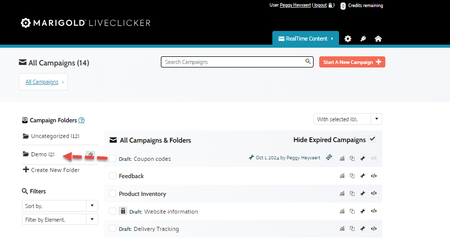 To move the campaign to a different folder, click the folder icon to display the folder structure and select a different folder: