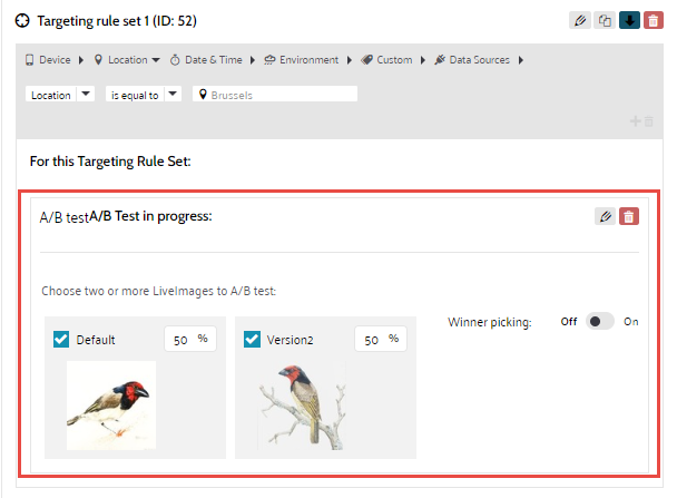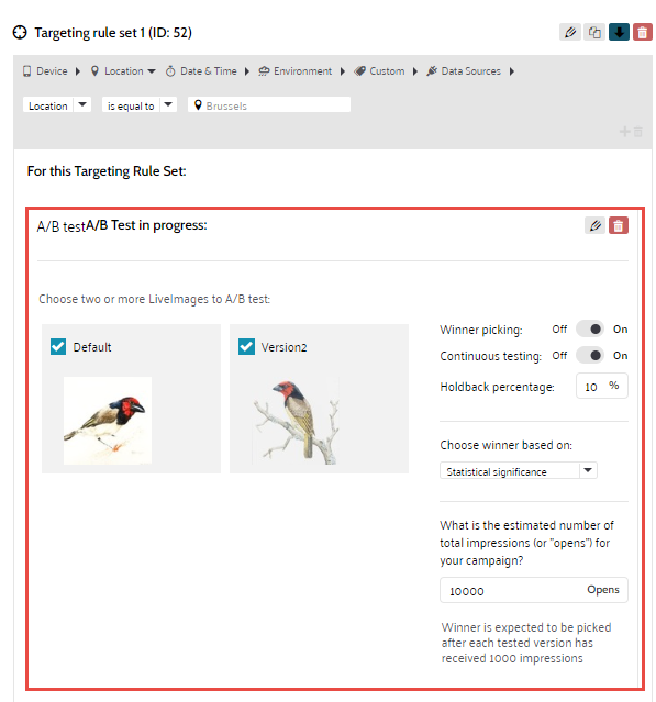 2. The different versions of the LiveImage are loaded together with the A/B test options: