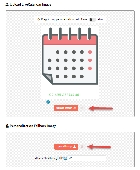 4. Last, an image needs to be uploaded for your calendar button, as well as a fallback image with clickthrough URL. The fallback image will be delivered if there is an error passing the personalized event details, if your campaign has expired or your account has run out of credits with overages turned off.