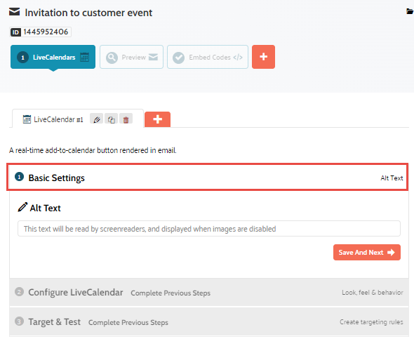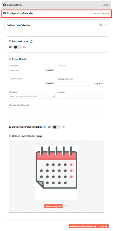 5. If you want to add more versions of the Calendar invite, click the Add Alternate LiveCalendar button at the bottom and execute the same steps for each new version added.