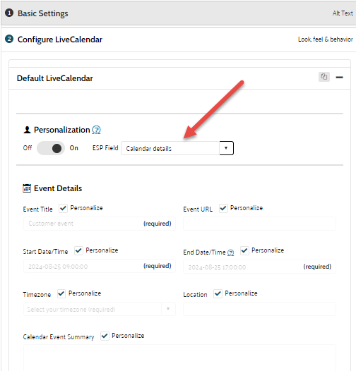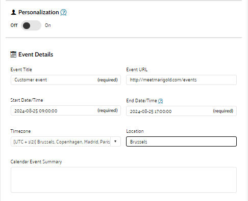 2. Choose between personalizing the calendar event to each opener, or use static values. Use the Personalization toggle to confirm your choice.