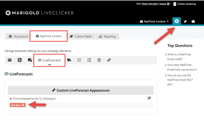 1. To configure a new CSS, go to the Account Settings in the top menu, and then navigate to Realtime content>LiveForecasts:
