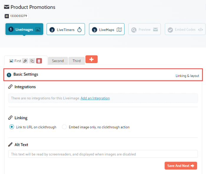 Linking — Define if a clickthrough URL is required or only the embedded image, without the possibility to click through. The actual URL is configured further down in the settings of the image itself and can be different for each of the versions of the image. It is recommended to always set a clickthrough URL as this helps driving engagement.