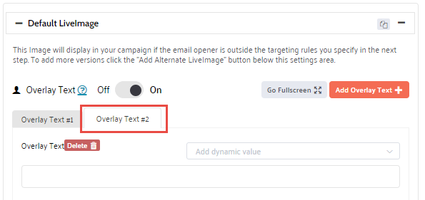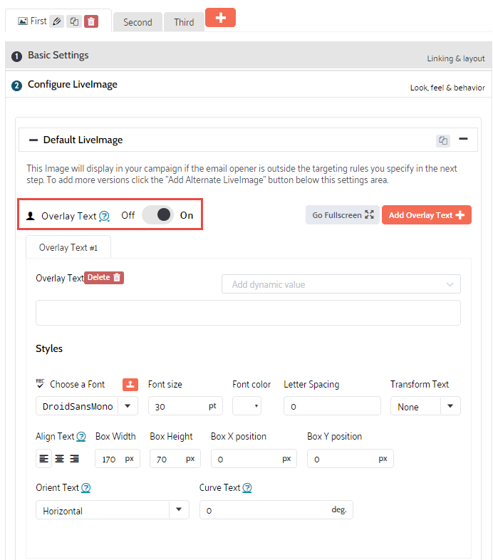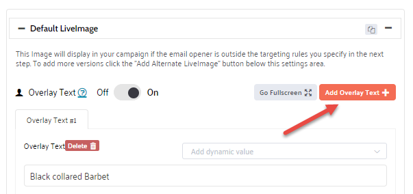 To make the overlay text dynamic (for example, use the opener's name), select a custom or dynamic field from the Add dynamic value selector. This will personalize the overlay text with ESP data (custom field) or with data imported into Liveclicker (dynamic values). Please read this topic on how to personalize your LiveImage for more details on all the options.