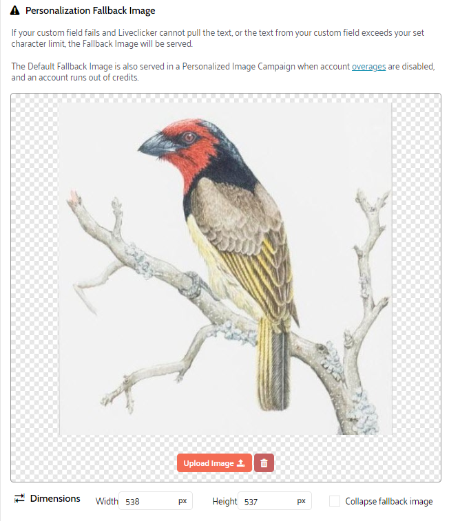 7. When an overlay text is added to the image, a fallback image is mandatory, in case the overlay text cannot be displayed because of issues with custom values used in the text, or when the text exceeds the character limit. The fallback image will also be shown when an account runs out of credit and no overages are allowed.