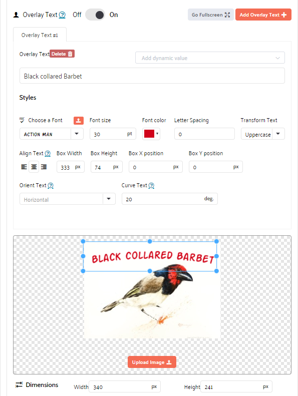 Note: You can add multiple Overlay texts to the image (for example, place one at the top of the image and one at the bottom). Click the Add Overlay Text button to add additional text boxes.