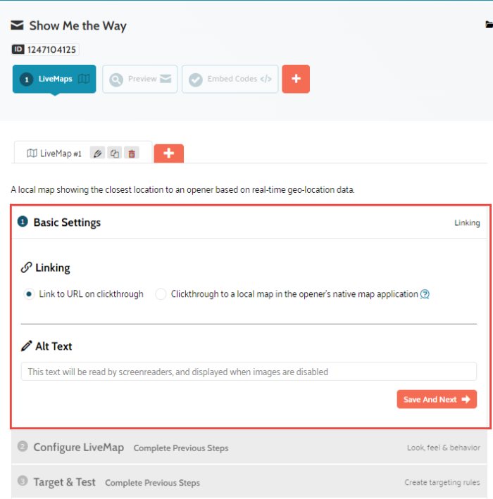 Linking — choose whether you would like your LiveMaps to have a clickthrough URL. If not, choose the other option to Clickthrough to a local map in the opener's native map application. Selecting this second option means the following: