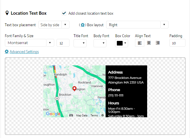 9. Next, in the Location Text box section, you can indicate if in addition to the map, you also want to display a text box with the closest location details. This includes custom map attributes such a location phone number and opening hours, providing the recipient more details on the proposed location.