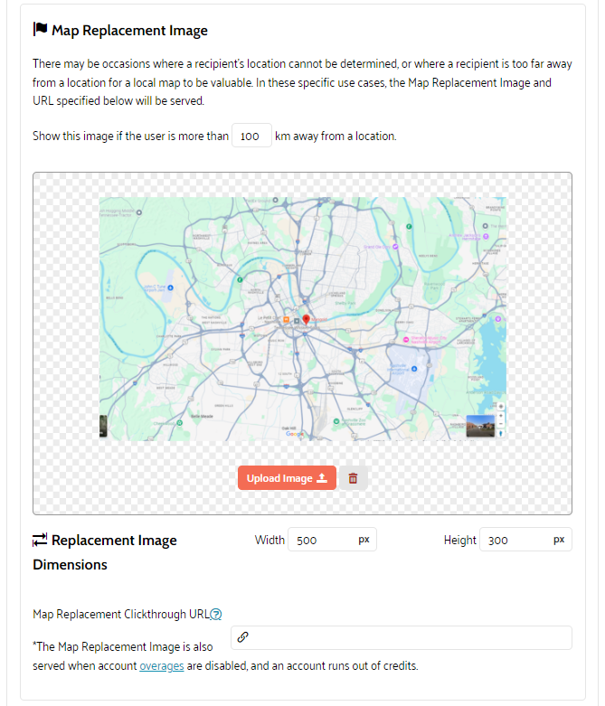 11. There may be occasions where a recipient's location cannot be determined, or where a recipient is too far away from a location for a local map to be valuable. In these specific use cases, the Map Replacement Image and URL specified below will be served. The Map Replacement Image is also served when account overages are disabled, and an account runs out of credits.