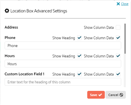 If you choose to show a column but don't enter a custom name for it, Liveclicker will use the friendly names that appear in the overlay: Address, Phone, Hours, Custom Location Field 1, Custom Location Field 2, etc.