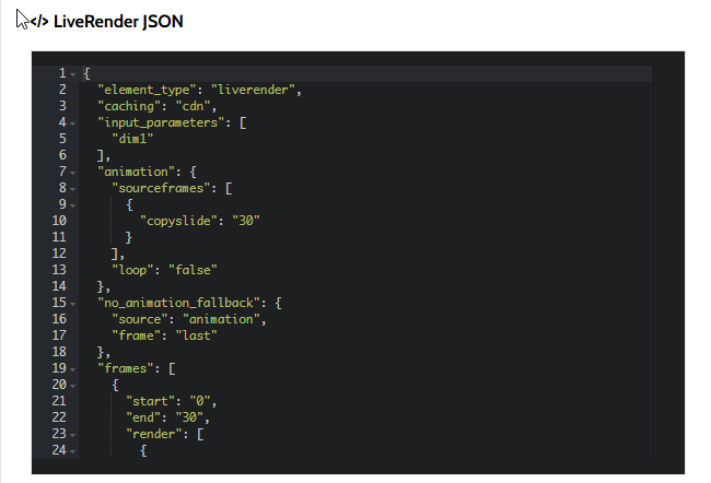 Note: LiveRender is an advanced element for setting complex personalized animations and images. It is recommended to have the assistance of a skilled developer in JSON format. To help expedite the process, developers can use one of our LiveRender Templates which come complete with sample code.