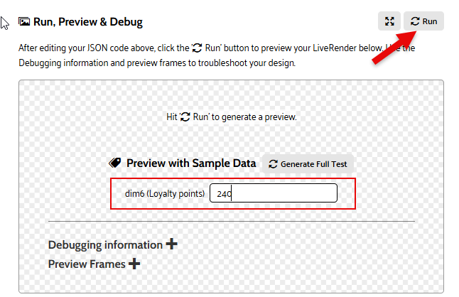 6. Click Run to execute the code and see the result for the entered value for the Custom field in the preview. Use the Full screen button to display the JSON and the preview in full screen to optimize your workspace.