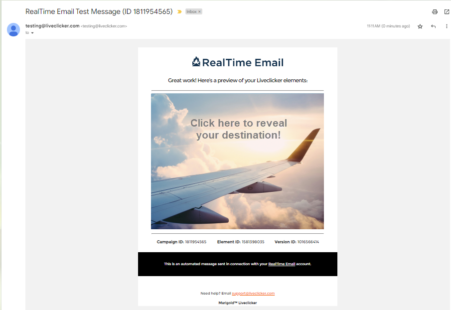 Note: If the user reopens the email after revealing, the Hidden Image will automatically be served in the email. This is so you don't prompt a user to reveal more than once. When clicked, the Hidden Image will take the user the pre-configured clickthrough URL.