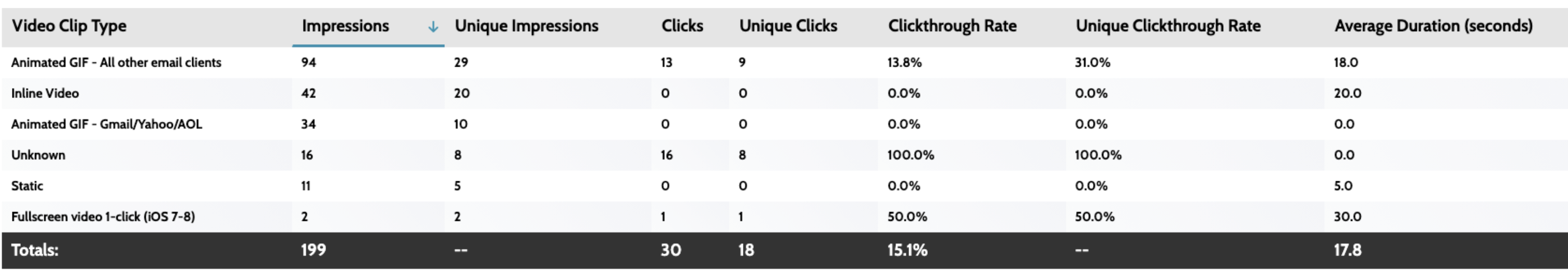 - Unknown — This happens when Liveclicker cannot determine which clip type was served to a recipient. This only happens in one use case: when Liveclicker can't associate a clickthrough on a campaign with an individual impression.