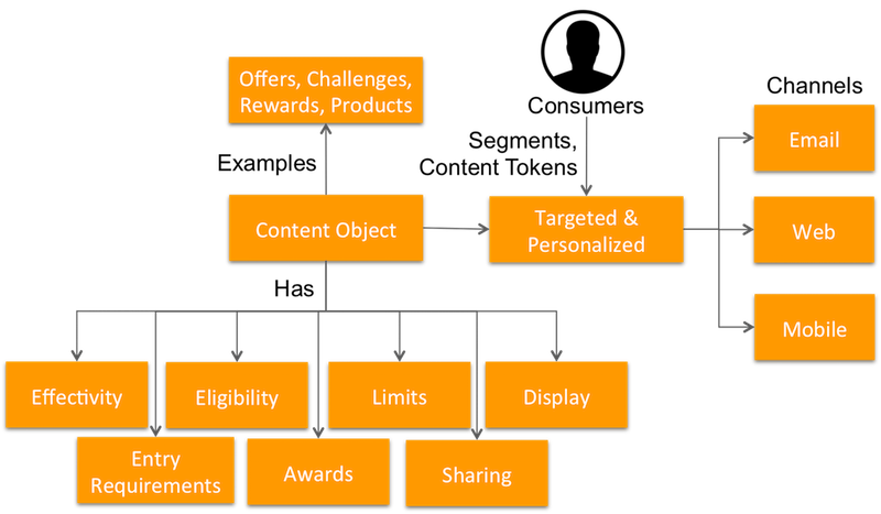The purpose built content management module of the Loyalty Platform provides consistent handling for all marketing and program content, including Offers, Challenges, Rewards, Products, etc. Essentially, each of them is a specialization of the base content object and the base content object provides capabilities shared by all.
