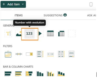 2. Under Analytics > Dashboard > + New dashboard, click on the +Add item button. Click on the 123 button under the Items tab.