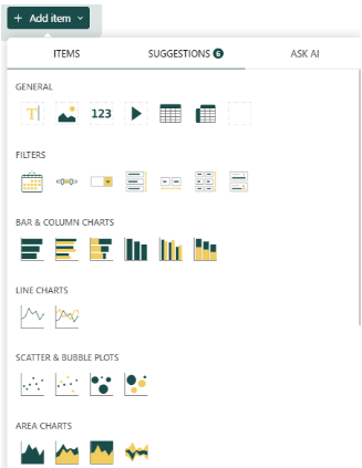 - Items: The first tab displays several components that you can add to your dashboard to display results, such as text, pivot tables, video, filters, charts (including hierarchical charts and financial charts), plots, gauges, maps, et al. If you want one or several of these elements, simply drag and drop them into your dashboard.