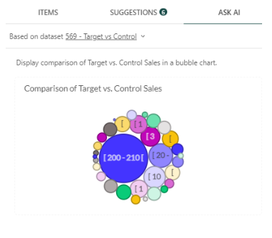 - Ask AI: This tab utilizes OpenAI to generate projected metrics based on the request you enter. Simply type in your request into the blank area, e.g., “Display the comparison of Target vs. Control Sales in a bubble chart,” then click Send. Based on the datasets given, the OpenAI API will generate your output. Note that the results may contain inaccurate information.