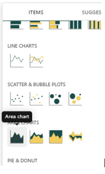 5. Another useful metric are charts in KPI dashboards. Select, for example, the Area chart by clicking on the +Add item button and clicking on an area chart under the Items tab.