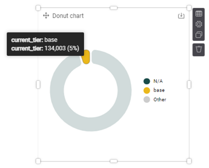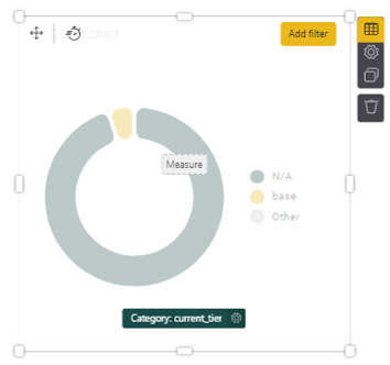 6. Another useful metric in KPIs might be to assess members by tier. Select a chart, such as a Donut chart (+ Add item button, scroll down and click on Donut chart under Items tab). For the Category, select from the right Members > current_tier to see all members in the current tier. You could either select an element for your Measure, or you can leave this blank. When blank, the Measure displays the total count of records within a dataset.
