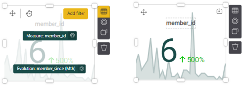 This gives you the total count of members by member_id. Add another element to the Evolution dashed square, such as member_since by month (found in Member > member_since, then select time period, as pictured on left). When you click out of the chart, it renders the metrics, as shown on the right (there were 6 new members over the past month which was a 500% increase).