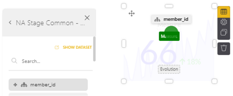 4. From the dataset on the right, click on NA Stage Common - Member. Then from the resulting column of items, drag and drop member_id over into the dashed box labeled Measure. Be sure to line up the selected item with the dashed box such that the color turns green.