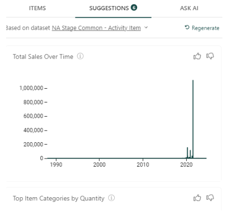 - Suggestions: This tab makes suggestions for datasets that might be useful. Some examples include Seasonal Trends in Sales, Target Sales over Time, a comparison of Target vs. Control Sales, et al. If you’d like to see additional suggestions, you can click on Regenerate, and additional suggestions will be displayed. Drag and drop any of these into your dashboard and rearrange and resize the element as desired.